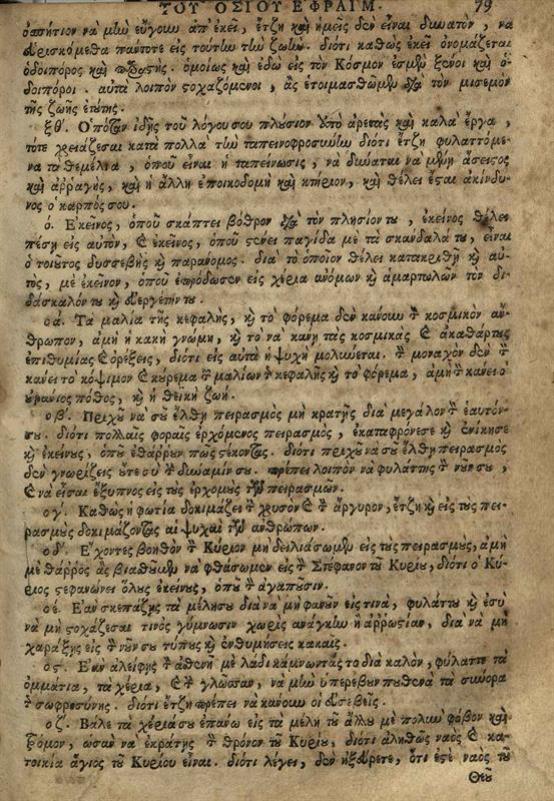 Ἐφραὶμ ὁ Σύρος. Λόγοι καὶ παραινέσεις... μεταγλωττισθέντες παρ᾽ Ἱεροθέου Ἱερομονάχου Ἰβηρίτου..., Βενετία, Ἀντώνιος Βόρτολις, 1721.