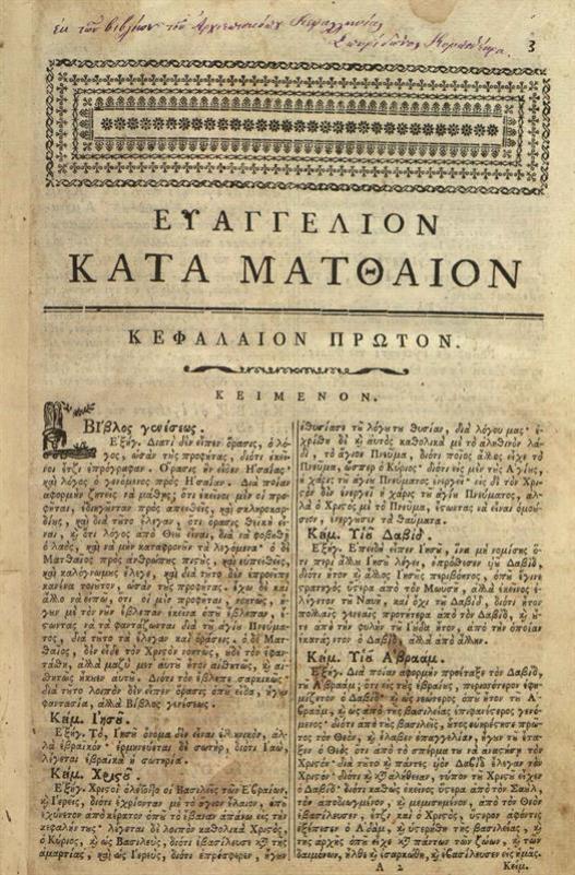 Θεοφύλακτος Βουλγαρίας. Θεοφυλάκτου Ἀρχιεπισκόπου Βουλγαρίας Ἑρμηνεία εἰς τὰ τέσσερα Εὐαγγέλια. Μεταγλωττισθεῖσα... παρά τινος Σοφοῦ... Ἀνωνύμου..., Βενετία, Ἀντώνιος Βόρτολις, 1788.