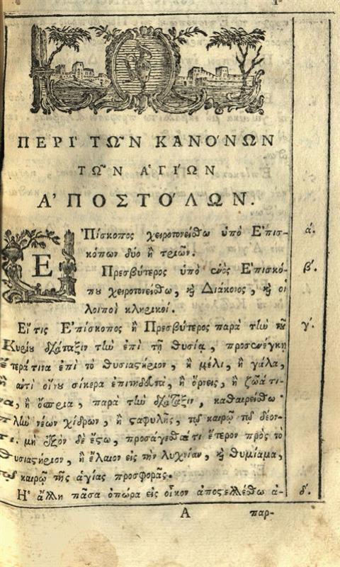 Νεόφυτος Καυσοκαλυβίτης. Συλλογὴ πάντων τῶν ἱερῶν καὶ θείων Κανόνων... Ἀποστόλων..., Βενετία, Ἀντώνιος Βόρτολις, 1787.