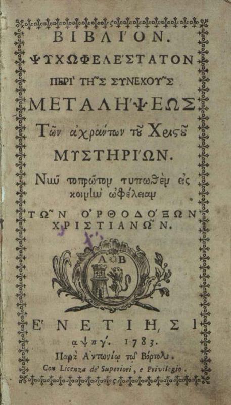 [Μακάριος Νοταρᾶς]. Βιβλίον ψυχωφελέστατον περὶ τῆς συνεχοῦς Μεταλήψεως Τῶν ἀχράντων... Μυστηρίων..., Βενετία, Ἀντώνιος Βόρτολις, 1783.