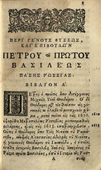 [Ἀθανάσιος Σκιαδᾶς]. Γένος, Ἦθος Κίνδυνοι καὶ Κατορθώματα Πέτρου τοῦ Πρώτου... Αὐτοκράτορος... ῾Ρωσίας..., Βενετία, Ἀντώνιος Βόρτολις, 1737.