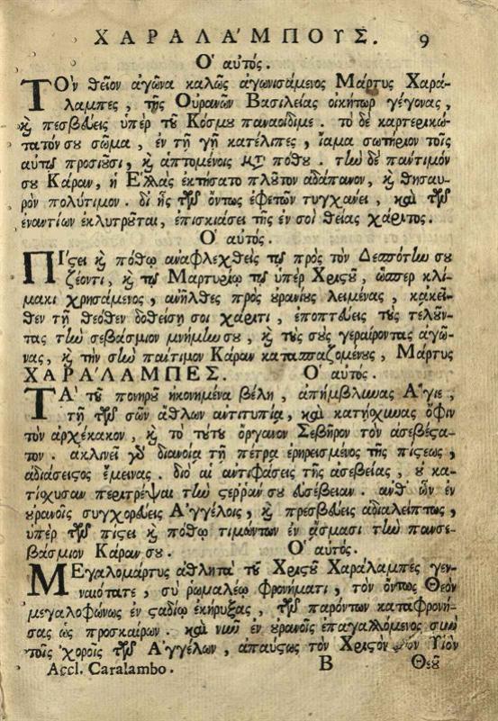 Γεώργιος Τραπεζούντιος. Ἀκολουθία τοῦ ἁγίου ἱερομάρτυρος Χαραλάμπους τοῦ Θαυματουργοῦ..., Βενετία, Ἀντώνιος Βόρτολις, 1766.