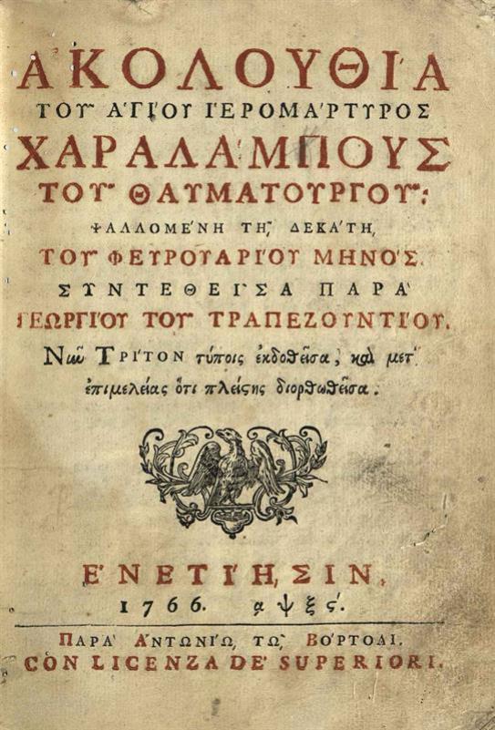 Γεώργιος Τραπεζούντιος. Ἀκολουθία τοῦ ἁγίου ἱερομάρτυρος Χαραλάμπους τοῦ Θαυματουργοῦ..., Βενετία, Ἀντώνιος Βόρτολις, 1766.