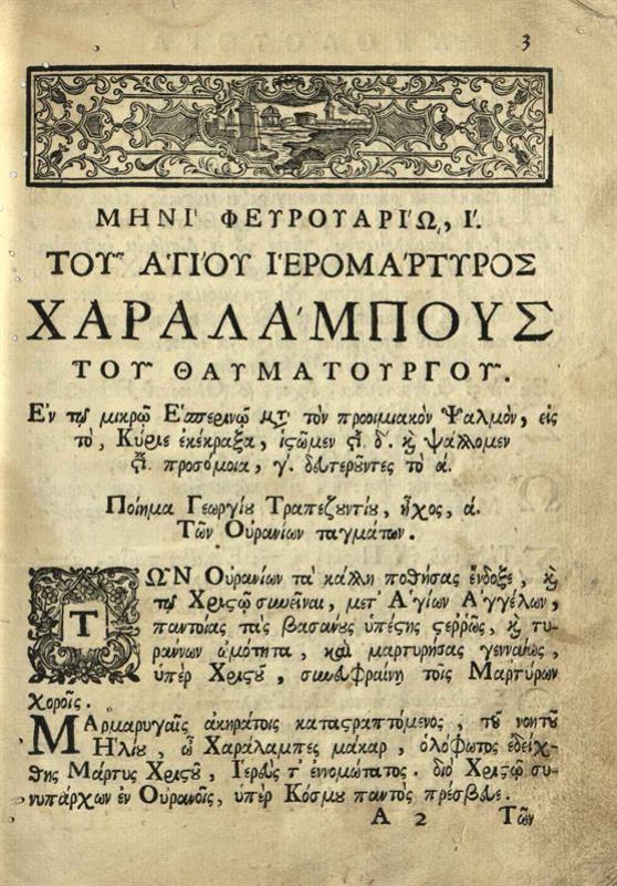 Γεώργιος Τραπεζούντιος. Ἀκολουθία τοῦ ἁγίου ἱερομάρτυρος Χαραλάμπους τοῦ Θαυματουργοῦ..., Βενετία, Ἀντώνιος Βόρτολις, 1766.