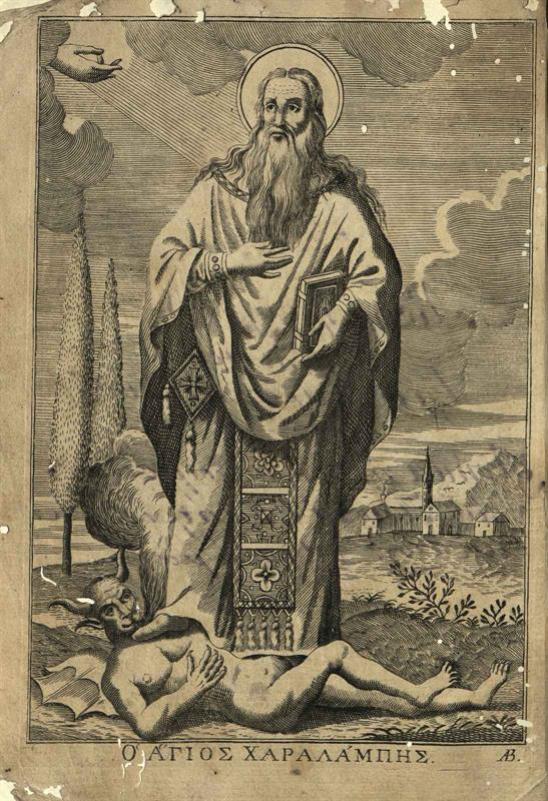 Γεώργιος Τραπεζούντιος. Ἀκολουθία τοῦ ἁγίου ἱερομάρτυρος Χαραλάμπους τοῦ Θαυματουργοῦ..., Βενετία, Ἀντώνιος Βόρτολις, 1766.