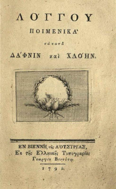 Λόγγος. Λόγγου Ποιμενικὰ τὰ κατὰ Δάφνιν καὶ Χλόην..., Βιέννη, Γεώργιος Βεντότης, 1792.