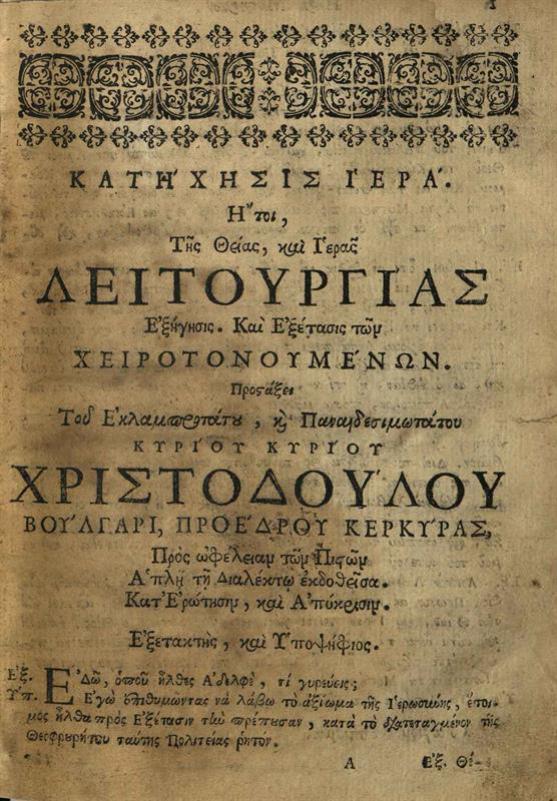 Νικόλαος Βούλγαρης. Κατήχησις Ἱερὰ ἤτοι τῆς Θείας... Λειτουργίας ἐξήγησις..., Βενετία, Λέων Γλυκύς, 1681.