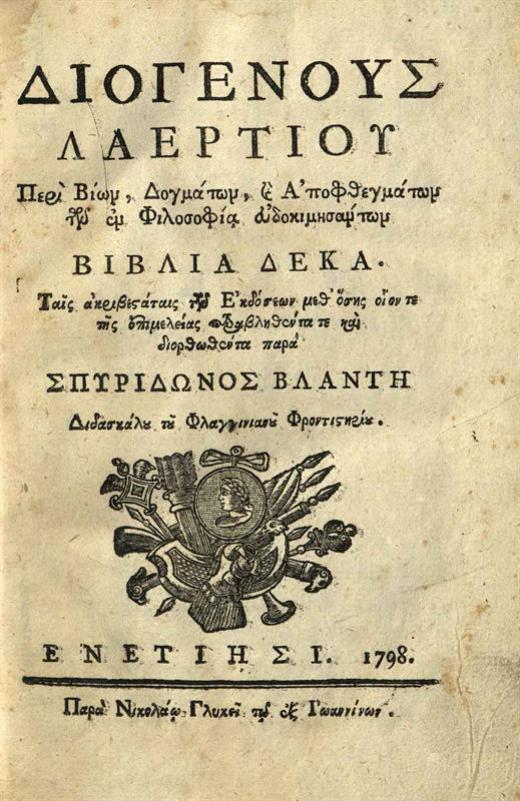 Διογένης Λαέρτιος. Διογένους Λαερτίου περὶ Βίων, Δογμάτων, καὶ Ἀποφθεγμάτων τῶν ἐν Φιλοσοφίᾳ εὐδοκιμησάντων Βιβλία Δέκα... διορθωθέντα παρὰ Σπυρίδωνος Βλαντῆ..., Βενετία, Νικόλαος Γλυκύς, 1798.
