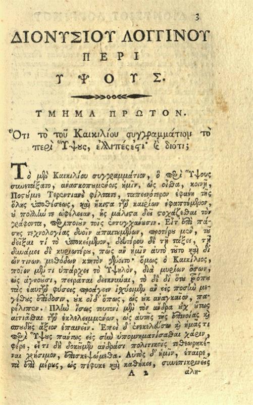 Διονύσιος Λογγίνος. Διονυσίου Λογγίνου Περὶ Ὕψους Βιβλίον..., ἐπιμελείᾳ Σπυρίδωνος Βλαντῆ, διδασκάλου τοῦ Φ.Φ. Παρ’ αὐτοῦ δὲ ἀφοσιωθὲν τῇ Φιλογενῇ καὶ Εὐεργετικωτάτῃ Ἀδελφότητι τῶν Kυρίων Ζωσιμάδων, Βενετία, Νικόλαος Γλυκύς, 1802.