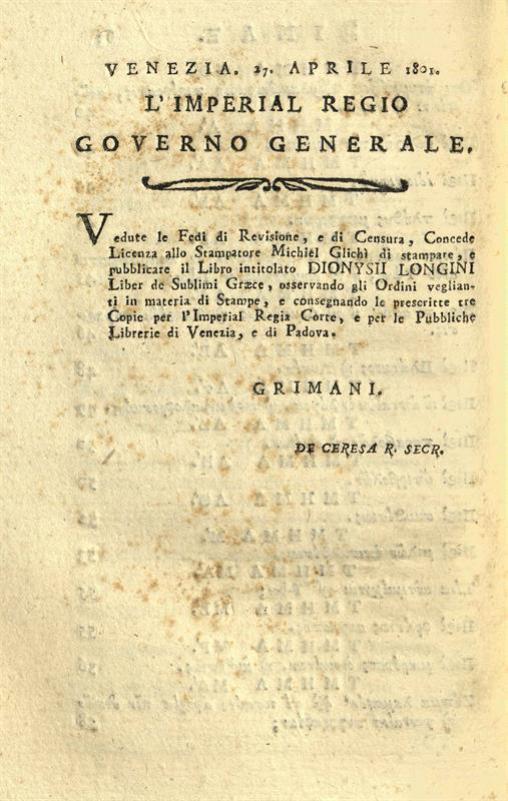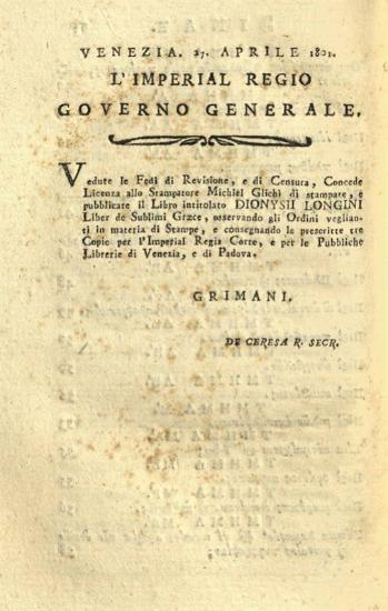 Διονύσιος Λογγίνος. Διονυσίου Λογγίνου Περὶ Ὕψους Βιβλίον..., ἐπιμελείᾳ Σπυρίδωνος Βλαντῆ, διδασκάλου τοῦ Φ.Φ. Παρ’ αὐτοῦ δὲ ἀφοσιωθὲν τῇ Φιλογενῇ καὶ Εὐεργετικωτάτῃ Ἀδελφότητι τῶν Kυρίων Ζωσιμάδων, Βενετία, Νικόλαος Γλυκύς, 1802.