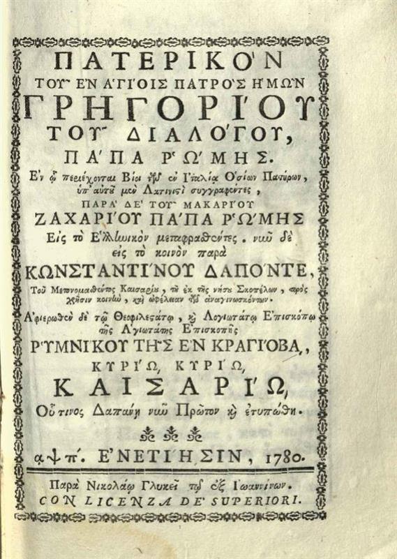 Γρηγόριος Α´ πάπας Ρώμης, Πατερικὸν... ἐν ᾧ περιέχονται βίοι τῶν ἐν Ἰταλίᾳ Ὁσίων Πατέρων... λατινιστὶ... παρὰ δὲ τοῦ μακαρίου Ζαχαρίου πάπα Ρὠμης εἰς τὸ ἑλληνικὸν μεταφρασθέντες, νῦν δὲ εἰς τὸ κοινὸν παρὰ Κωνσταντίνου Δαπόντε..., Βενετία, Νικόλαος Γλυκής, 1780.