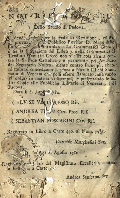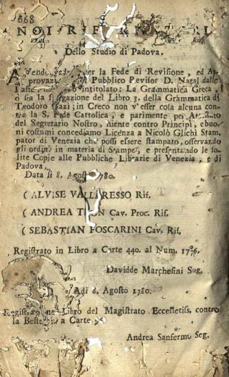 Δανιὴλ Κεραμεύς. Ἑρμηνεία εἰς τὸ τέταρτον τῆς τοῦ Θεοδώρου τοῦ Γαζῆ Γραμματικῆς..., Βενετία, Νικόλαος Γλυκύς, 1785.