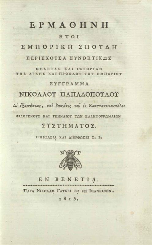 Νικόλαος Παπαδόπουλος, Ἑρμῆς ὁ Κερδῶος ἤτοι Ἐμπορικὴ Ἐγκκλοπαιδεία --- διὰ προτροπῆς καὶ δαπάνης τοῦ ἐν Κωνσταντινουπόλει τιμίου και φιλογενοῦς ἐμπορικοῦ συστήματος τῶν Ἑλλήνων μεγαλεμπόρων --- ἐπιστασίᾳ καὶ διορθώσει Σ.[πυρίδωνος] Β.[λαντῆ] ---, Ἑρμάνθη ἤτοι Ἐμπορικὴ Σπουδὴ περιέχουσα συνοπτικῶς μελέτας καὶ ἱστορίαν τῆς ἀρχῆς καὶ προόδου τοῦ ἐμπορίου ---, Βενετία, Νικόλαος Γλυκής, 1815.
