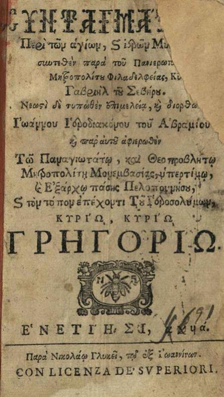Γαβριὴλ Σεβῆρος. Συνταγμάτιον Περὶ τῶν ἁγίων, καὶ ἱερῶν Μυστηρίων συντεθὲν παρὰ τοῦ Πανιερωτάτου Μητροπολίτου Φιλαδελφείας... διορθώσει Ἰωάννου... Ἀβραμίου..., Βενετία, Νικόλαος Γλυκύς, 1691.