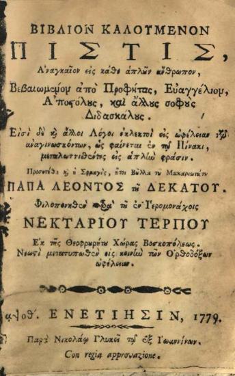 Νεκτάριος Τέρπος, Βιβλίον καλούμενον Πίστις ἀναγκαῖον εἰς κάθε ἁπλοῦν ἄνθρωπον..., Βενετία, Νικόλαος Γλυκύς, 1779.