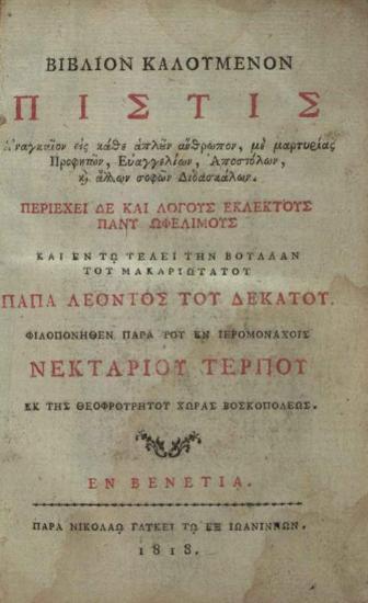 Νεκτάριος Τέρπος. Βιβλίον καλούμενον Πίστις ἀναγκαῖον εἰς κάθε ἁπλοῦν ἄνθρωπον..., Βενετία, Νικόλαος Γλυκύς, 1818.