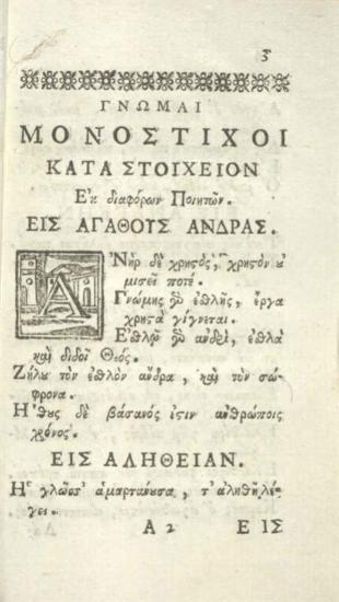 Ἐμμανουὴλ Χρυσολωρᾶς. Γνωμολογικὸν περιέχον τὰ κατὰ Ἀλφάβητον Γνωμικὰ Μονόστιχα..., Βενετία, Νικόλαος Γλυκύς, 1793.