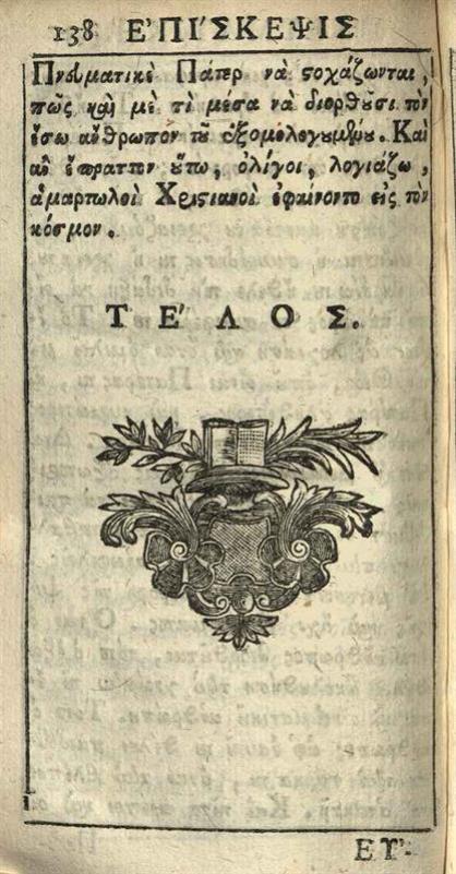 [Μεθόδιος Ἀνθρακίτης]. Ἐπίσκεψις πνευματικὴ..., μετατυπωθεῖσα καὶ ἐπιμελῶς διορθωθεῖσα..., Βενετία, Νικόλαος Γλυκύς, 1780.