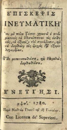 [Μεθόδιος Ἀνθρακίτης]. Ἐπίσκεψις πνευματικὴ..., μετατυπωθεῖσα καὶ ἐπιμελῶς διορθωθεῖσα..., Βενετία, Νικόλαος Γλυκύς, 1780.