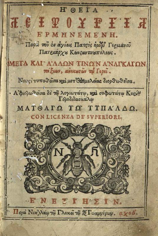 Γερμανός, Πατριάρχης Κωνσταντινουπόλεως. Ἡ Θεία Λειτουργία..., νεωστὶ τυπωθεῖσα..., Βενετία, Νικόλαος Γλυκύς, 1672.