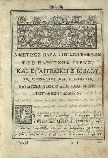 Ἰωάννης ἐκ Λίνδου. Ἱερὰ Βίβλος καλουμένη Ἀποστολικὴ Σαγήνη ἧς τὰ μέρη δύω..., Βενετία, Νικόλαος Γλυκύς, 1785.