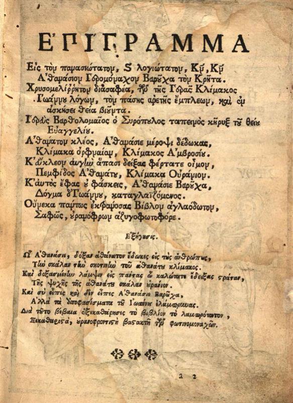 Ἰωάννης τῆς Κλίμακος. Βιβλίον ψυχωφελὲς... Νέος Κλίμακας ἐξηγημένος παρὰ... Ἀθανασίου [Βαρούχα] τοῦ Κρητὸς..., Βενετία, Νικόλαος Γλυκύς, 1693.