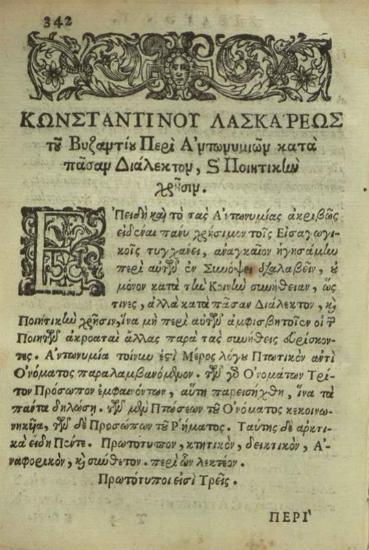 Κωνσταντῖνος Λάσκαρης. Γραμματικὴ..., Βενετία, Νικόλαος Γλυκύς, 1673.