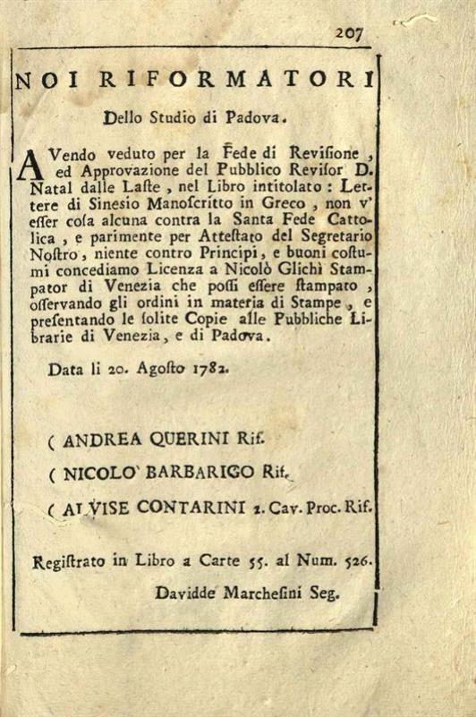 Συνέσιος Κυρήνης. Ἐπιστολάριον... διορθωθὲν ὑπὸ Ἀνθίμου Βέρα..., Βενετία, Νικόλαος Γλυκύς, 1782.
