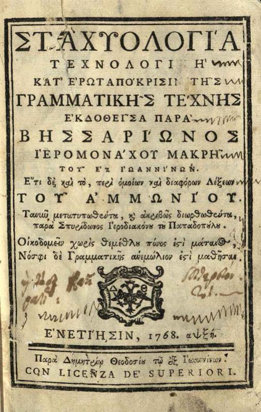 Βησσαρίων Μακρῆς. Σταχυολογία Τεχνολογικὴ..., διορθωθέντα, παρὰ Σπυρίδωνος... Παπαδοπούλου..., Βενετία, Δημήτριος Θεοδοσίου, 1768.