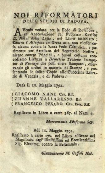 Προκόπιος Πελοποννήσιος. Βιβλίον καλούμενον Ἔλεγχος κατὰ ἀθέων καὶ δυσσεβῶν, περιέχον λόγους κεφαλαιώδεις..., Βενετία, Δημήτριος Θεοδοσίου, τ. Α´-Β´, 1792.