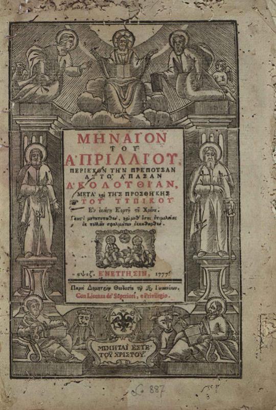 Μηναῖον τοῦ Ἀπριλλίου..., Βενετία, Δημήτριος Θεοδοσίου, 1777.