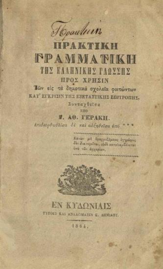 Γ. Ἀθ. Γεράκης. Πρακτικὴ Γραμματικὴ τῆς Ἑλληνικῆς Γλώσσης..., Κυδωνίες, Ε. Δημίδης, 1864.