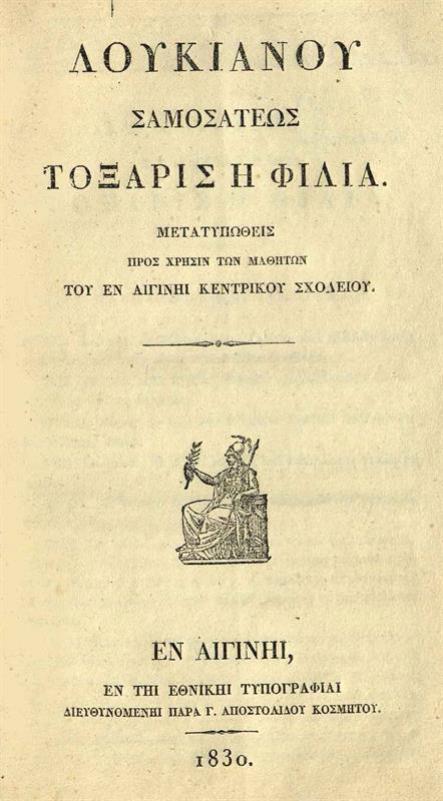 Λουκιανός, Λουκιανοῦ Σαμοσατέως Τόξαρις ἢ Φιλία, Αἴγινα, Ἐθνικὴ Τυπογραφία, 1830.