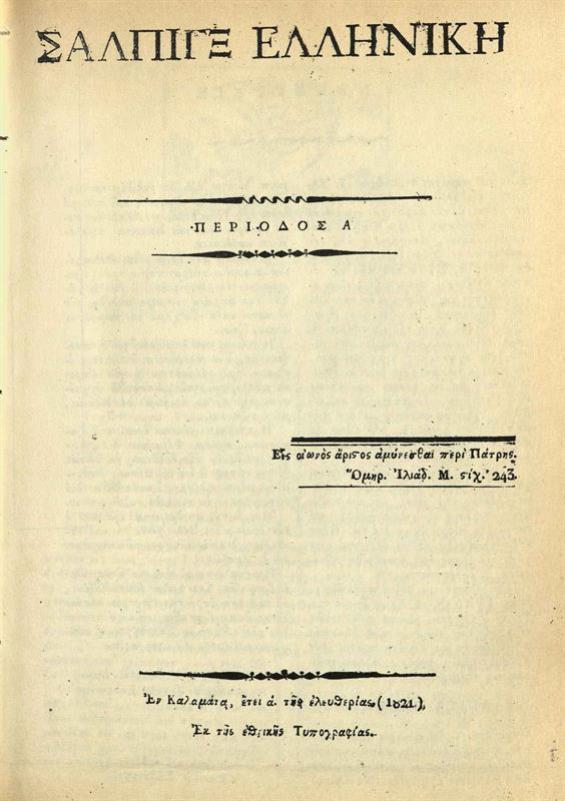 Σάλπιγξ Ἑλληνική, «Ἐκ τῆς ἐθνικῆς τυπογραφίας», «Ἐν Καλαμάτα, ἔτει α´ τῆς ἐλευθερίας», 1821.