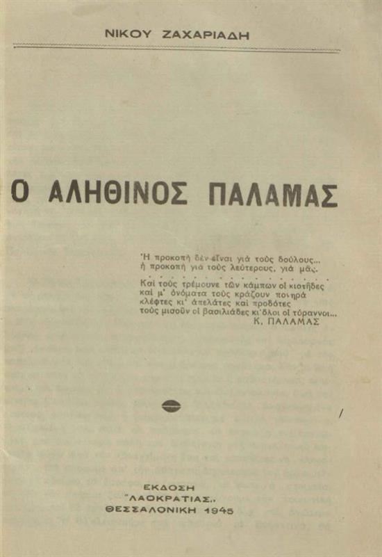 Νίκος Ζαχαριάδης, Ὁ ἀληθινὸς Παλαμᾶς ---, Ἔκδοση “Λαοκρατίας”, Θεσσαλονίκη 1945.