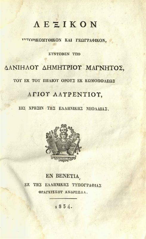 Δανιὴλ Δημητρίου Μάγνης, Λεξικὸν Ἱστορικομυθικὸν καὶ Γεωγραφικόν, Βενετία, Ἑλληνικὴ Τυπογραφία Φραγκίσκου Ἀνδρεώλα, 1834.