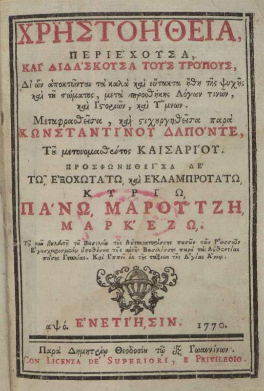[G. della Casa]. Χρηστοήθεια... Μεταφρασθεῖσα, καὶ στιχουργηθεῖσα παρὰ Κωνσταντίνου Δαπόντε..., Βενετία, Δημήτριος Θεοδοσίου, 1770.