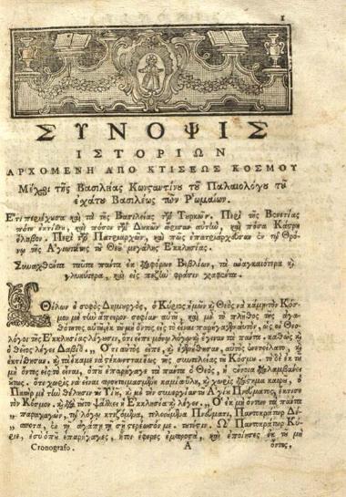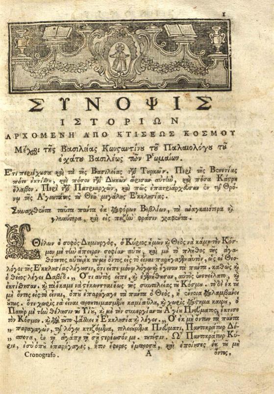 Δωρόθεος Μονεμβασίας. Βιβλίον ἱστορικὸν περιέχον ἐν συνόψει διαφόρους καὶ ἐξόχους ἱστορίας..., Βενετία, Πάνος Θεοδοσίου, 1805.
