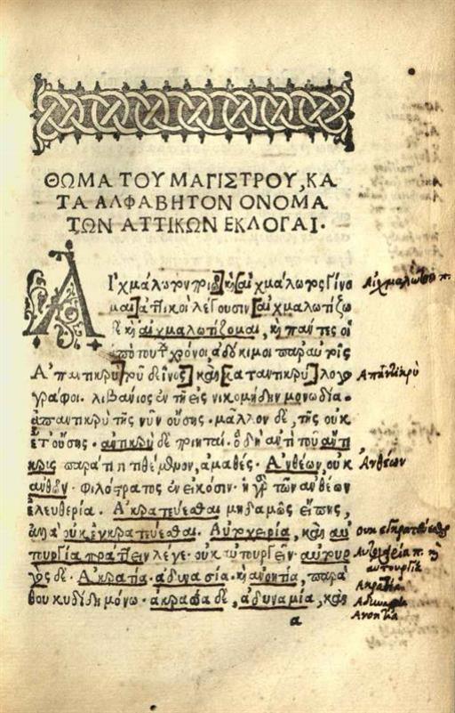 Θωμᾶς Μάγιστρος. Θωμᾶ τοῦ Μαγίστρου κατὰ ἀλφάβητον, ἀτθίδος διαλέκτου ἐκλογαί..., Ρώμη, Ζαχαρίας Καλλιέργης, 4 Μαρτίου 1517.