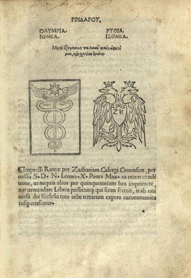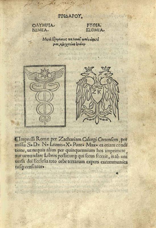Πίνδαρος. Πινδάρου, Ὀλύμπια. Πύθια. Νέμεα. Ἴσθμια. Μετὰ ἐξηγήσεως παλαιᾶς πάνυ ὠφελίμου, καὶ σχολίων ὁμοίων..., Ρώμη, Ζαχαρίας Καλλιέργης γιὰ τὸν Cornelius Benignus, 13 Αὐγούστου 1515.