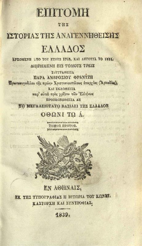 Ἀμβρόσιος Φραντζῆς. Ἐπιτομὴ τῆς Ἱστορίας τῆς ἀναγεννηθείσης Ἑλλάδος ἀρχομένη ἀπὸ τοῦ ἔτους 1715, καὶ λήγουσα τὸ 1835..., Ἀθήνα, τ. Α´-Β´, ἐκ τῆς Τυπογραφίας Ἡ Βιτώρια τοῦ Κωνστ. Καστόρχη καὶ συντροφίας, 1839, τ. Γ´-Δ´, ἐκ τῆς Τυπογραφίας Κ. Ράλλη, 1841.