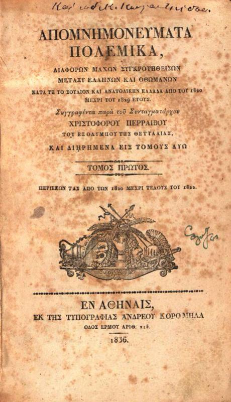 Χριστόφορος Περραιβός, Ἀπομνημονεύματα πολεμικά, Ἀθήνα, Τυπογραφία Ἀνδρέου Κορομηλᾶ, τ. Α΄-Β΄, 1836.