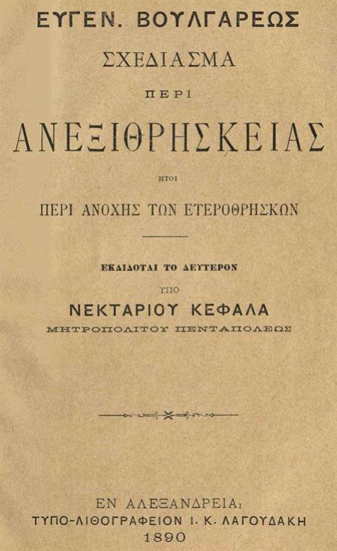 Εὐγένιος Βούλγαρης. Σχεδίασμα περὶ Ἀνεξιθρησκείας ἤτοι περὶ ἀνοχῆς τῶν ἑτεροθρήσκων... ὑπὸ Νεκταρίου Κεφαλᾶ Μητροπολίτου Πενταπόλεως..., Ἀλεξάνδρεια, Ι.Κ. Λαγουδάκης, 1890.