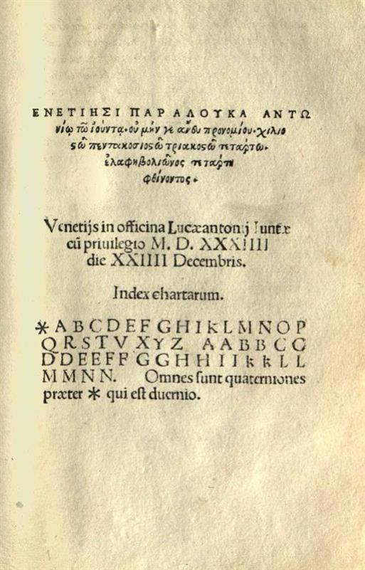 Ἀρσένιος Ἀποστόλης. Σχόλια... εἰς ἑπτὰ τραγῳδίας τοῦ Εὐριπίδου..., Βενετία, Λουκᾶς Ἀντώνιος τῶν Ἰούντα (Lucantonio), 1534.