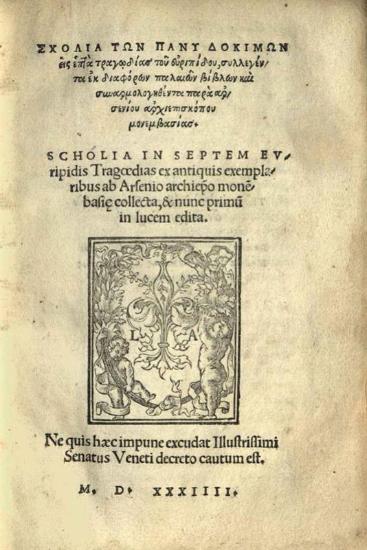 Ἀρσένιος Ἀποστόλης. Σχόλια... εἰς ἑπτὰ τραγῳδίας τοῦ Εὐριπίδου..., Βενετία, Λουκᾶς Ἀντώνιος τῶν Ἰούντα (Lucantonio), 1534.