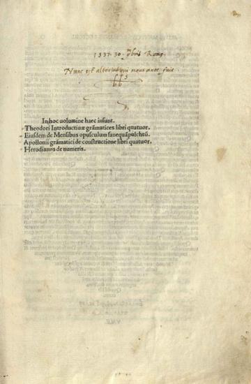 Θεόδωρος Γαζῆς. Γραμματικὴ Εἰσαγωγὴ..., Περὶ μηνῶν. Βίος Ἀπολλωνίου Ἀλεξανδρέως τοῦ γραμματικοῦ. Ἀπολλωνίου περὶ συντάξεως. Ἡρωδιανοῦ περὶ τῶν ἀριθμῶν [ἑλληνικὸ κείμενο μὲ λατινικὸ τίτλο], Βενετία, Ἄλδος Μανούτιος, 25 Δεκεμβρίου 1495.
