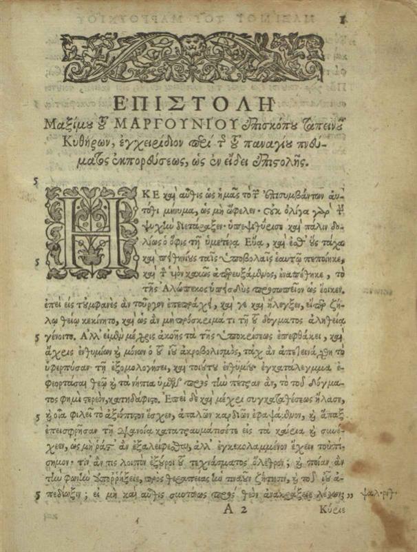 Μάξιμος Μαργούνιος. Μαξίμου τοῦ Μαργουνίου Ταπεινοῦ Κυθήρων Ἐπισκόπου Διάλογος. Τὰ πρόσωπα, Γραικὸς καὶ Λατῖνος (ἤτοι) Ὀρθόδοξος καὶ Λατίνος. Παῦλος πρὸς Ἐφεσίους, δ. 25. Ἀποθέμενοι τὸ ψεῦδος λαλεῖτε τὴν ἀλήθειαν ἕκαστος πρὸς τὸν πλησίον αὐτοῦ, ὅτι ἐσμὲν ἀλλήλων μέλη [Κωνσταντινούπολη, 1627]. (EL)