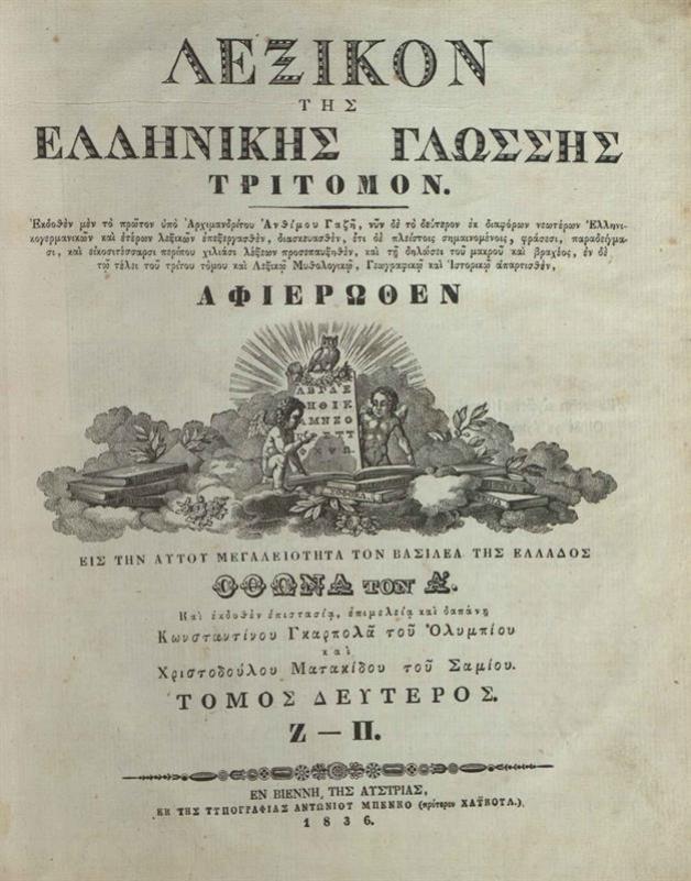 - Ἄνθιμος Γαζῆς. Λεξικὸν τῆς Ἑλληνικῆς Γλώσσης τρίτομον... ἐν δὲ τῷ τέλει τοῦ τρίτου τόμου καὶ Λεξικῷ Μυθολογικῷ, Γεωγραφικῷ καὶ Ἱστορικῷ ἀπαρτισθὲν..., Βιέννη, Ἀντώνιος Χαϋκούλ, τ. Α´, 1835, Ἀντώνιος Μπένκο (πρότερον Χαϋκούλ), τ. Β´, 1836, τ. Γ´, 1837.