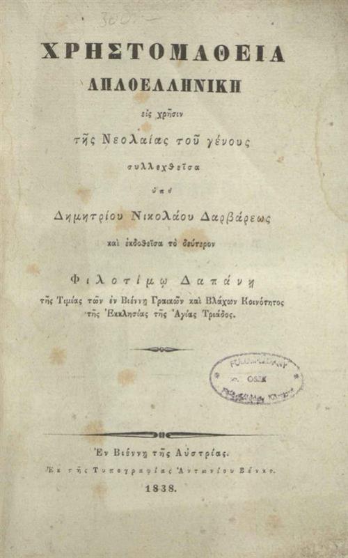 Δημήτριος Νικολάου Δάρβαρης. Χρηστομάθεια ἁπλοελληνικὴ..., Βιέννη, Ἀντώνιος Βένκο, 1838.