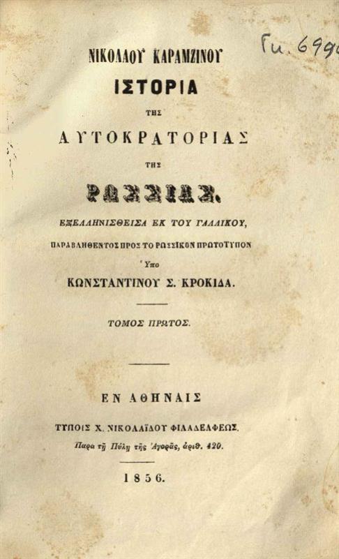Νικόλαος Καραμζίνος. Νικολάου Καραμζίνου Ἱστορία τῆς Αὐτοκρατορίας τῆς Ρωσσίας... ἐκ τοῦ γαλλικοῦ, παραβληθέντος πρὸς τὸ ρωσσικὸν πρωτότυπον Ὑπὸ Κωνσταντίνου Σ. Κροκιδᾶ..., τ. Α´, Ἀθήνα, Τύποις Χ. Νικολαΐδου Φιλαδελφέως, 1856.